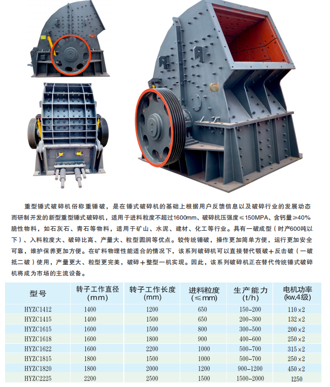 【产品简介】 重型锤式破碎机是直接将粒度为600毫米以下的物料破碎至50或60毫米以下的一段破碎用破碎机。本机适用于水 泥、化工、电力、冶金等工业部门破碎中等硬度的物料,如石灰石、炉渣、焦炭、煤等物料的中碎细碎作业。