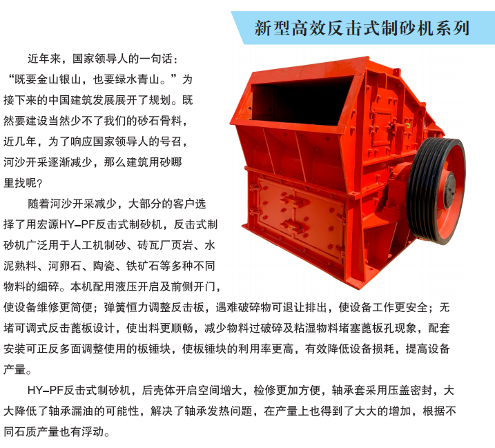 作为最先采用液压启动的新型反击式制砂机设备,在节能上要比传统制砂机省电50%。它可以把各种岩石、砂石,河卵石制成附和各种粒度的建筑用砂,砂质粒度均匀、耐压强度高,远比天然砂、普通锤式打砂机生产的砂更符合建筑要求,更能提高建筑质量。