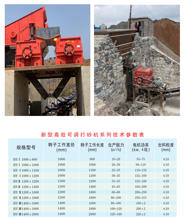 规格型号 | 转子工作直径(mm) | 转子工作长度(nm) | 生产能力(m3/h) | 电机功率(kw.4机) | 出料粒度(mm) |