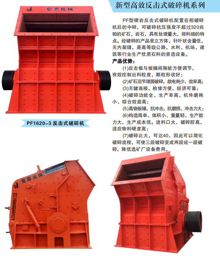 破碎机反击式将配置在粗破碎机后的中碎,可破碎抗压强度不超过320兆帕的矿石、岩石,具有处理量大,排料量细的特点。经破碎的产品呈立方体,针叶状含量低无内裂缝,适用公路,水利,机场,建筑等行业。